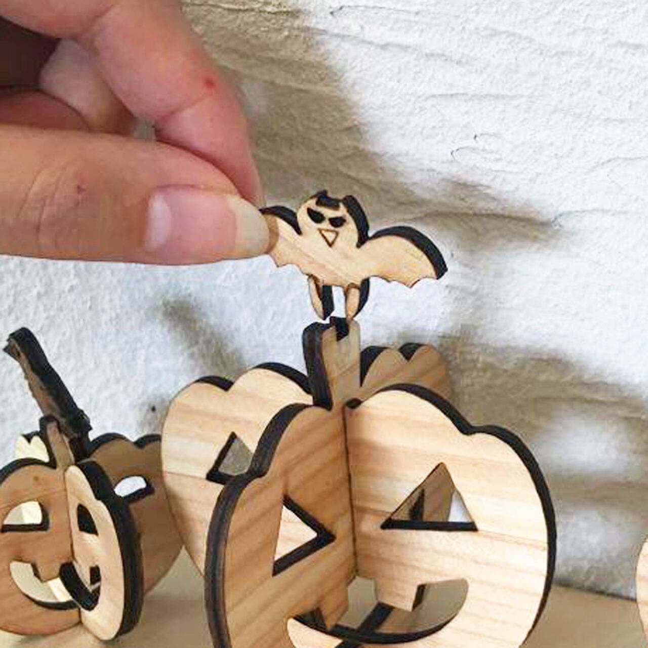 ジャックオランタンやコウモリ、おばけなど、ハロウィンでお馴染みのキャラクターたちを一枚の板から外し、切り込み同士を繋ぎ合わせて組み立てると・・・