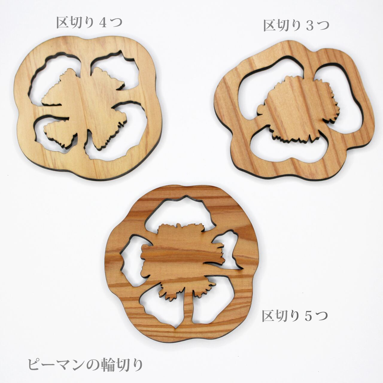 輪切りになったそれぞれのピーマンは、区切り(部屋)が3つ/4つ/5つとバリエーションがありますので、お好みの区切り数をお選びください。